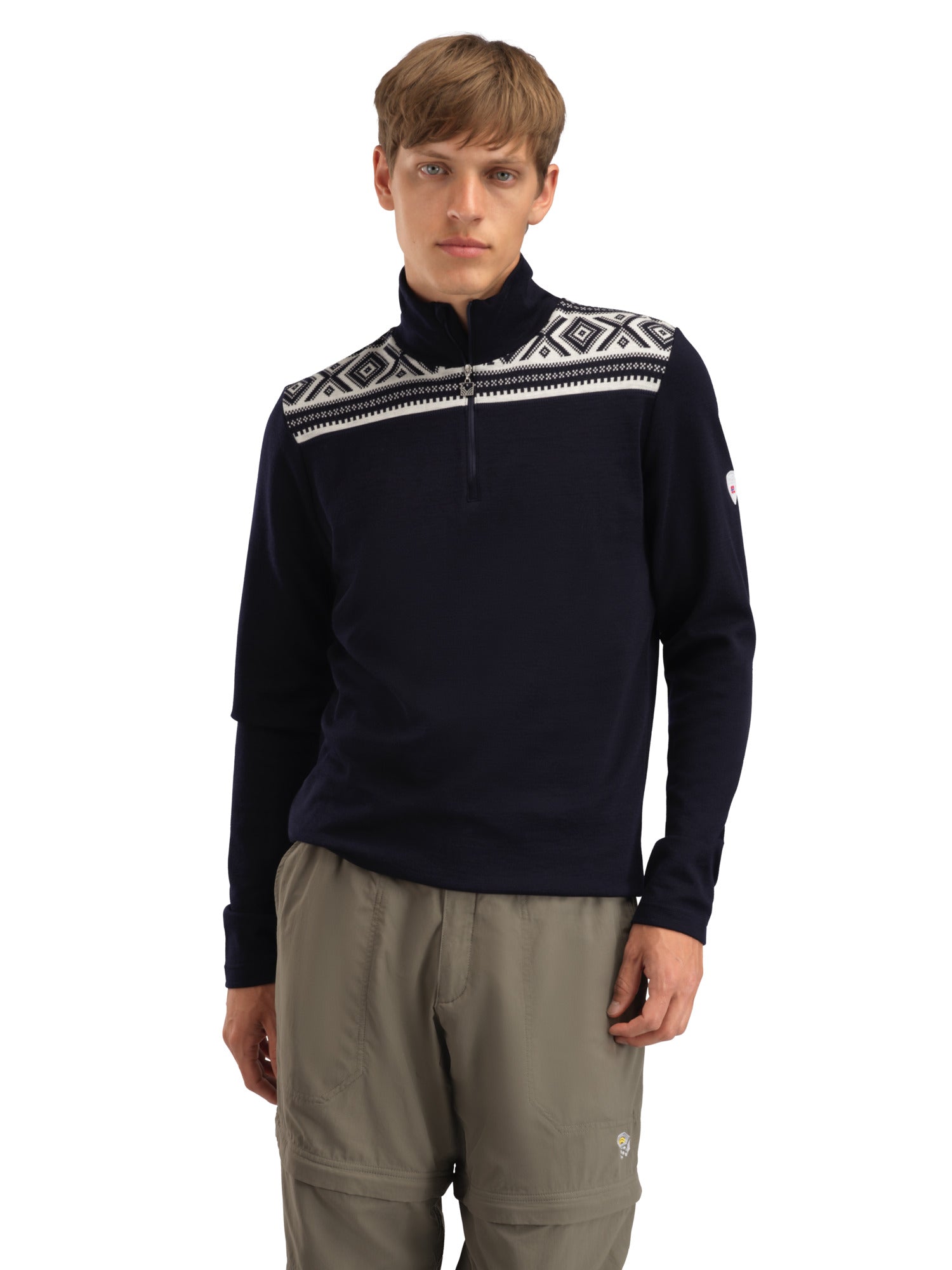 Dieser sportliche Pullover aus 100 % superfeiner und hautweicher Merinowolle, der eng gestrickt ist, um ein Durchscheinen zu vermeiden, kann als next to skin-Pullover oder als Basisschicht beim Sport verwendet werden. Das Cortina-Muster basiert auf dem ersten offiziellen Olympia-Pullover, der für die Olympischen Winterspiele 1956 in Cortina d'Ampezzo entworfen wurde. Das Muster, das die Essenz der traditionellen norwegischen Geschichte einfängt, ist zu einem der beliebtesten norwegischen Designs geworden.