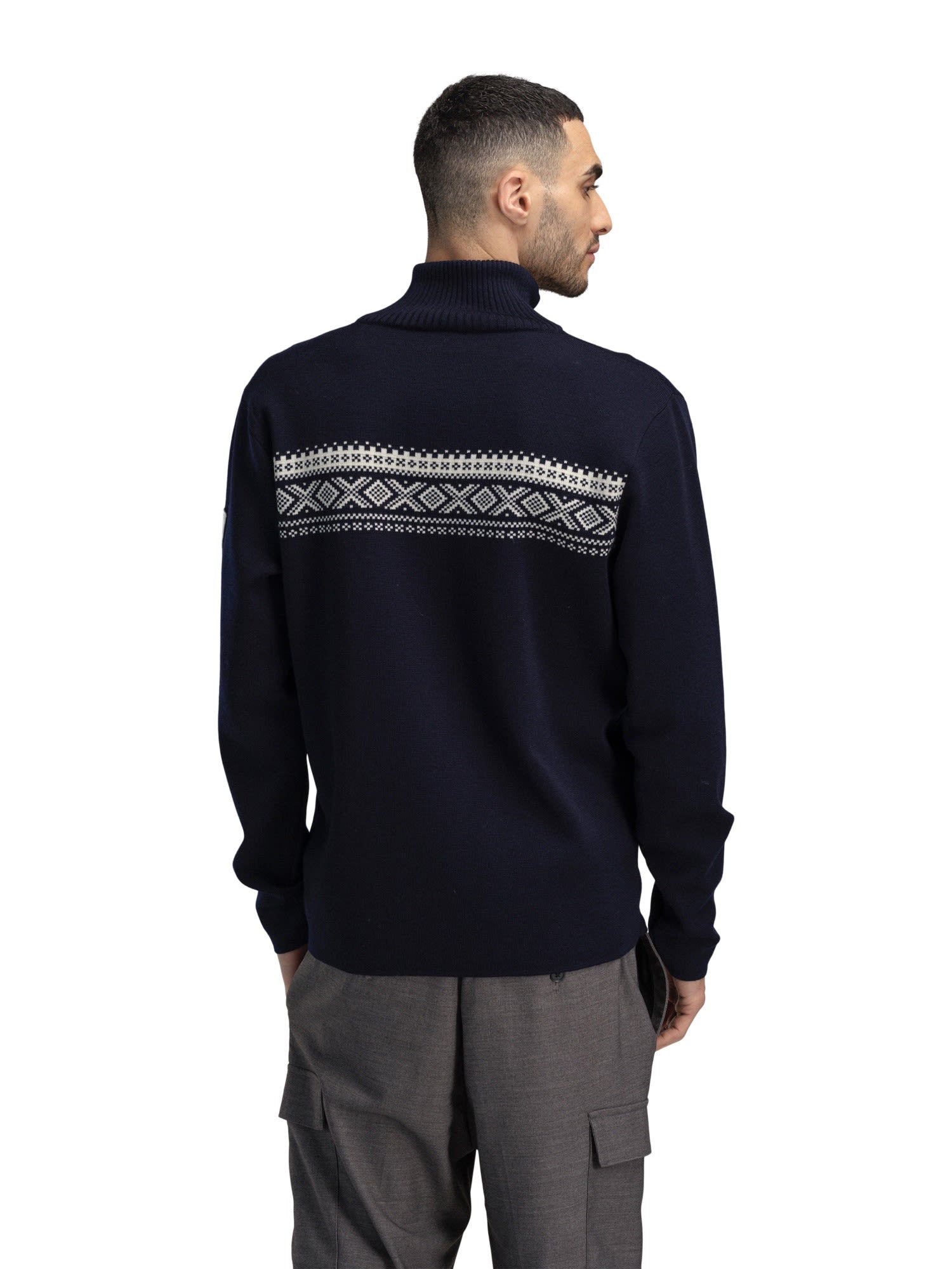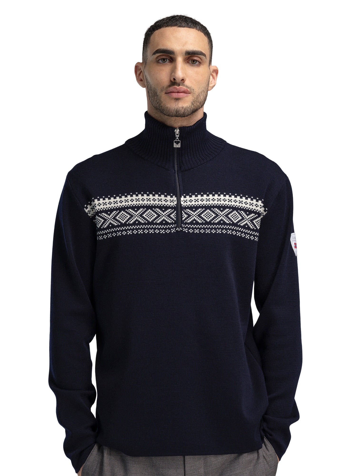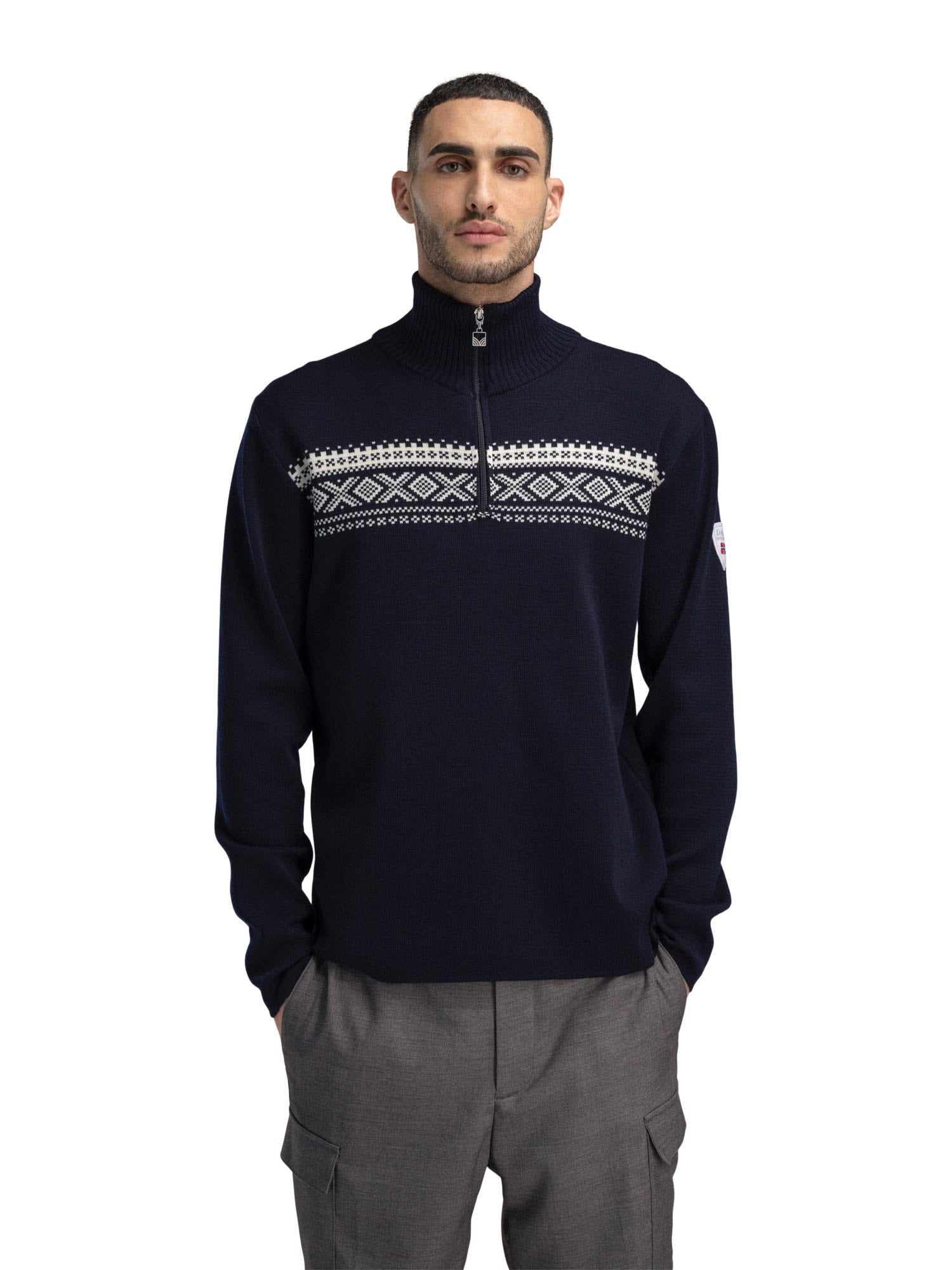 Der Dalestølen Sweater von DALE OF NORWAY für Herren aus Merinowolle ist eine sportlichere, leichtere Version des DALE OF NORWAY Cortina 1956 Pullovers.