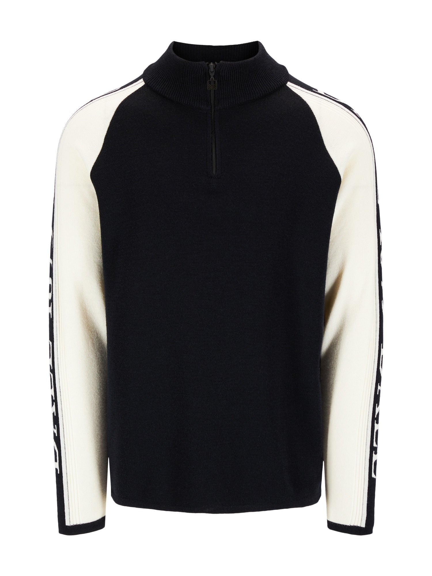 Ein weicher und sportlicher Pullover mit kontrastfarbenen Ärmeln, klaren Linien und einem halbhohen Halsausschnitt mit Reißverschluss.