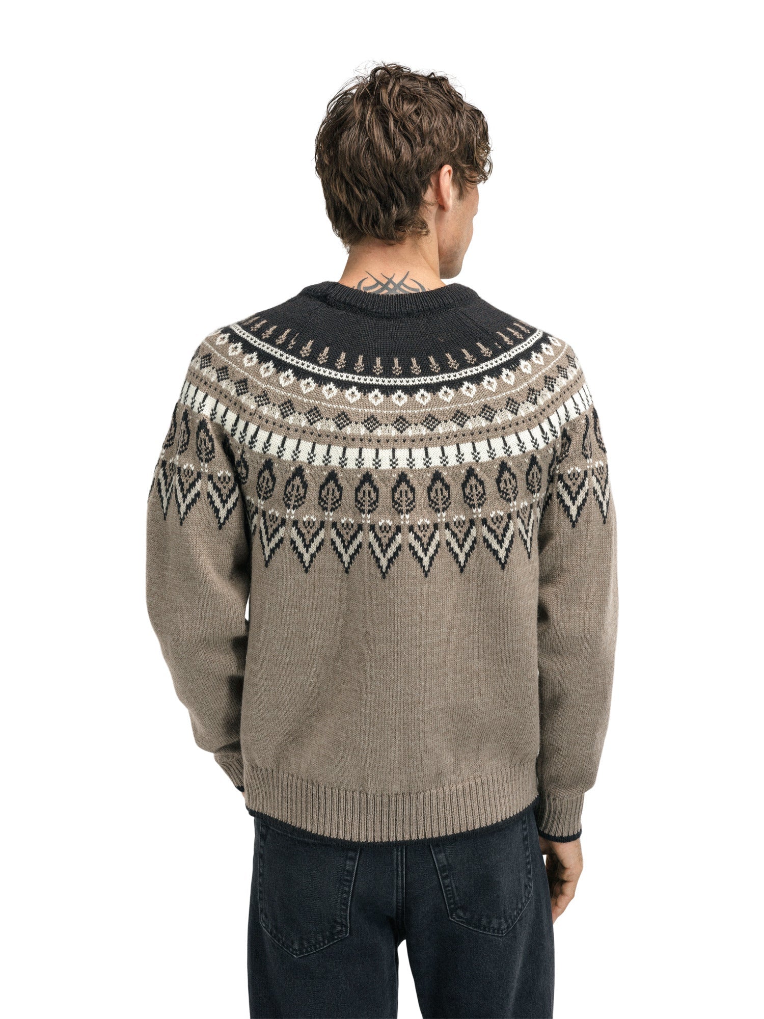 Ein schwerer, gemusterter Wollpullover mit einer lockeren Passform.