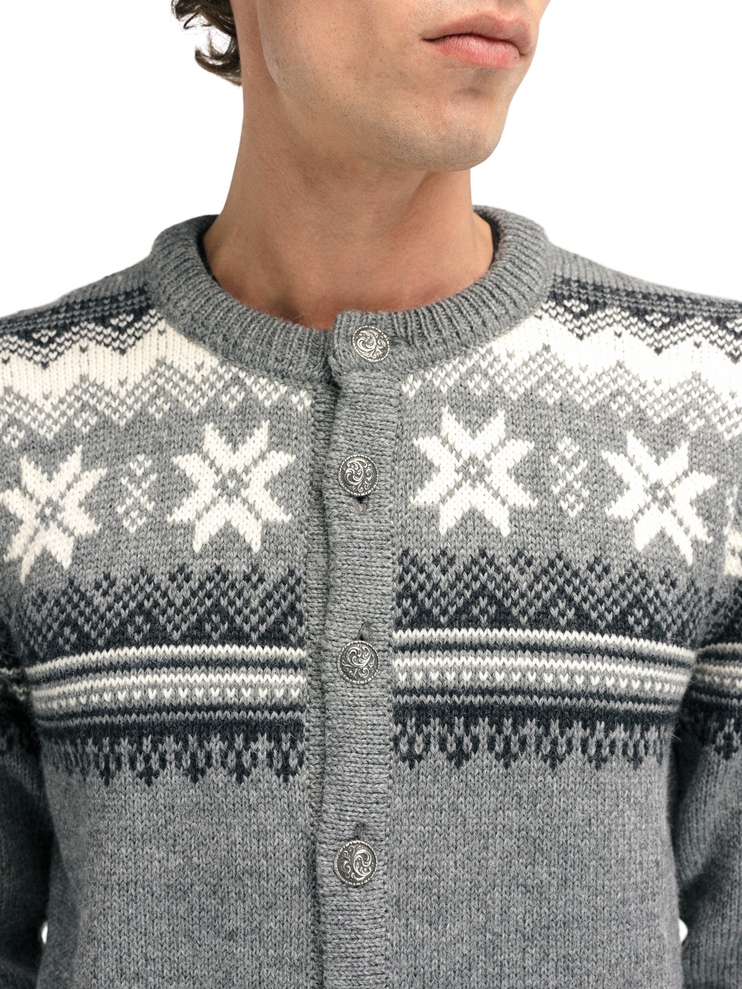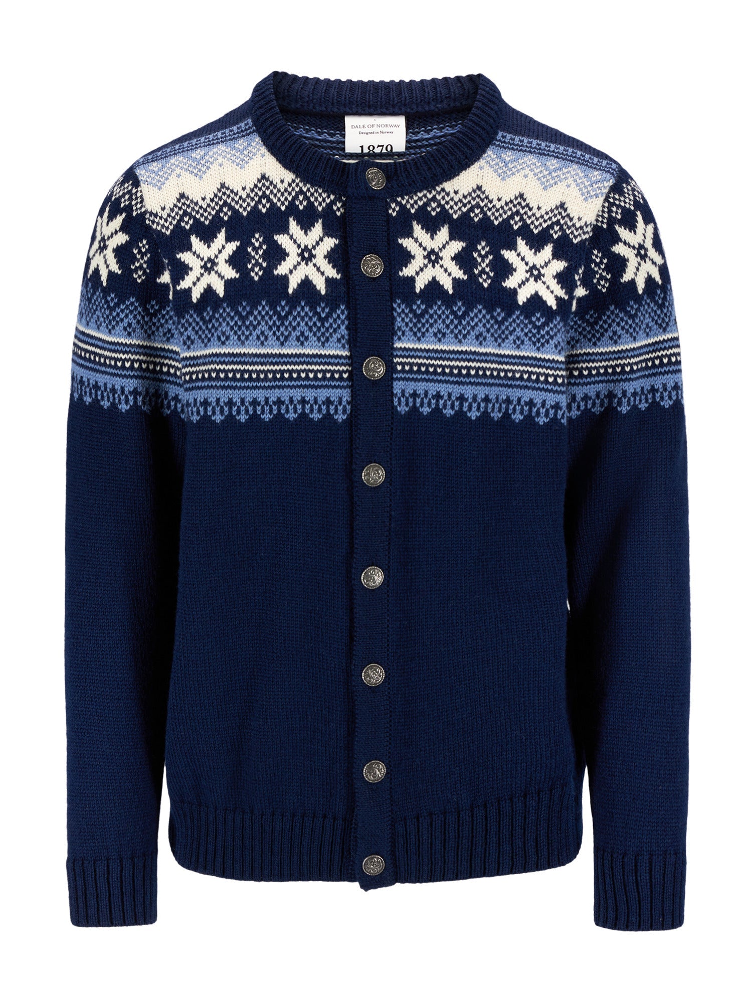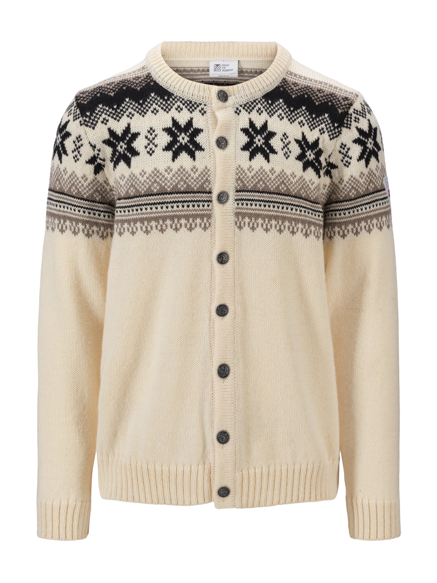 Eine klassische Retro-Wolljacke mit detaillierten Mustern, die an die 1950er und 60er Jahre erinnern. Die Jacke wird vorne mit norwegischen Zinnknöpfen geschlossen. Die Veafjord ist aus 100% langlebiger norwegischer Wolle gestrickt, was die Wolljacke besonders warm und langlebig macht.