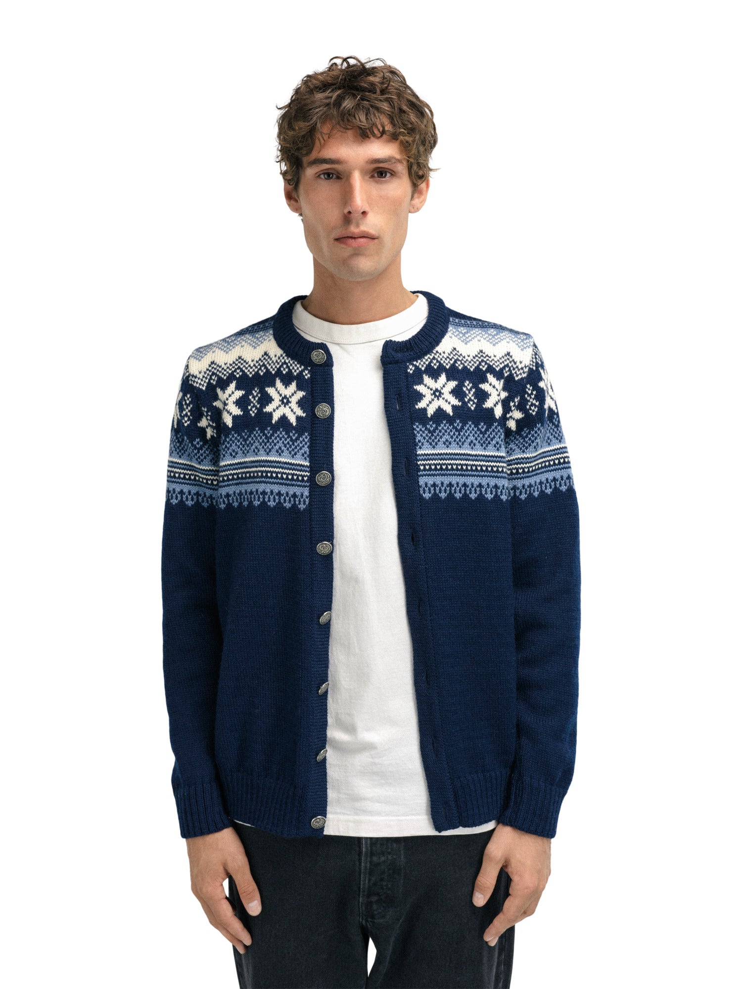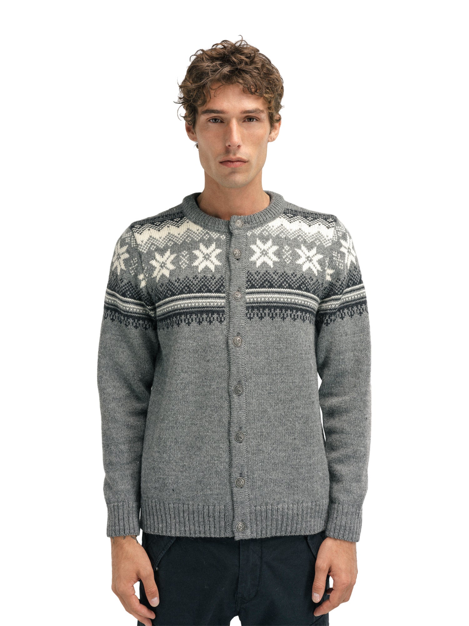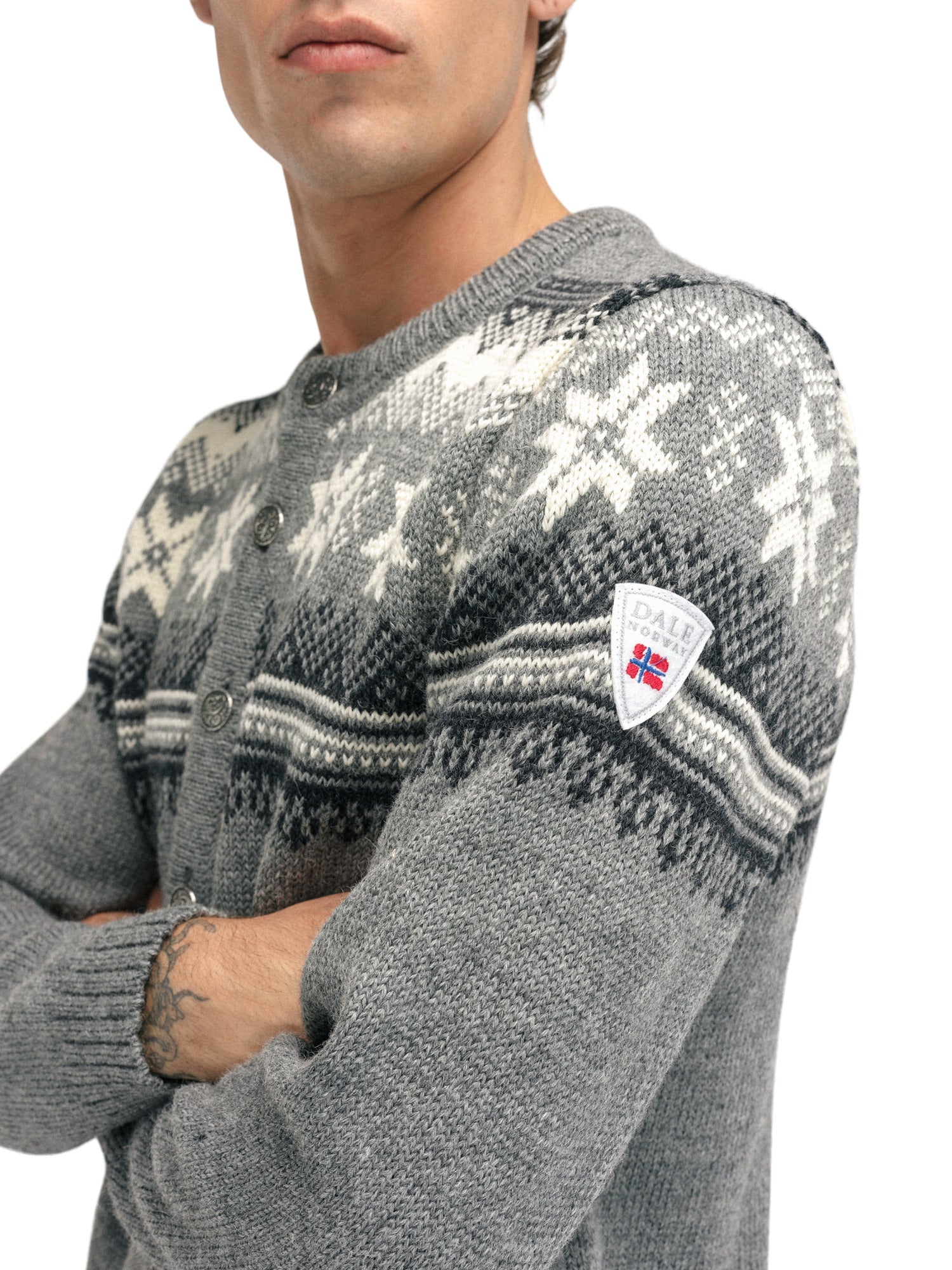 Eine klassische Retro-Wolljacke mit detaillierten Mustern, die an die 1950er und 60er Jahre erinnern. Die Jacke wird vorne mit norwegischen Zinnknöpfen geschlossen. Die Veafjord ist aus 100% langlebiger norwegischer Wolle gestrickt, was die Wolljacke besonders warm und langlebig macht.