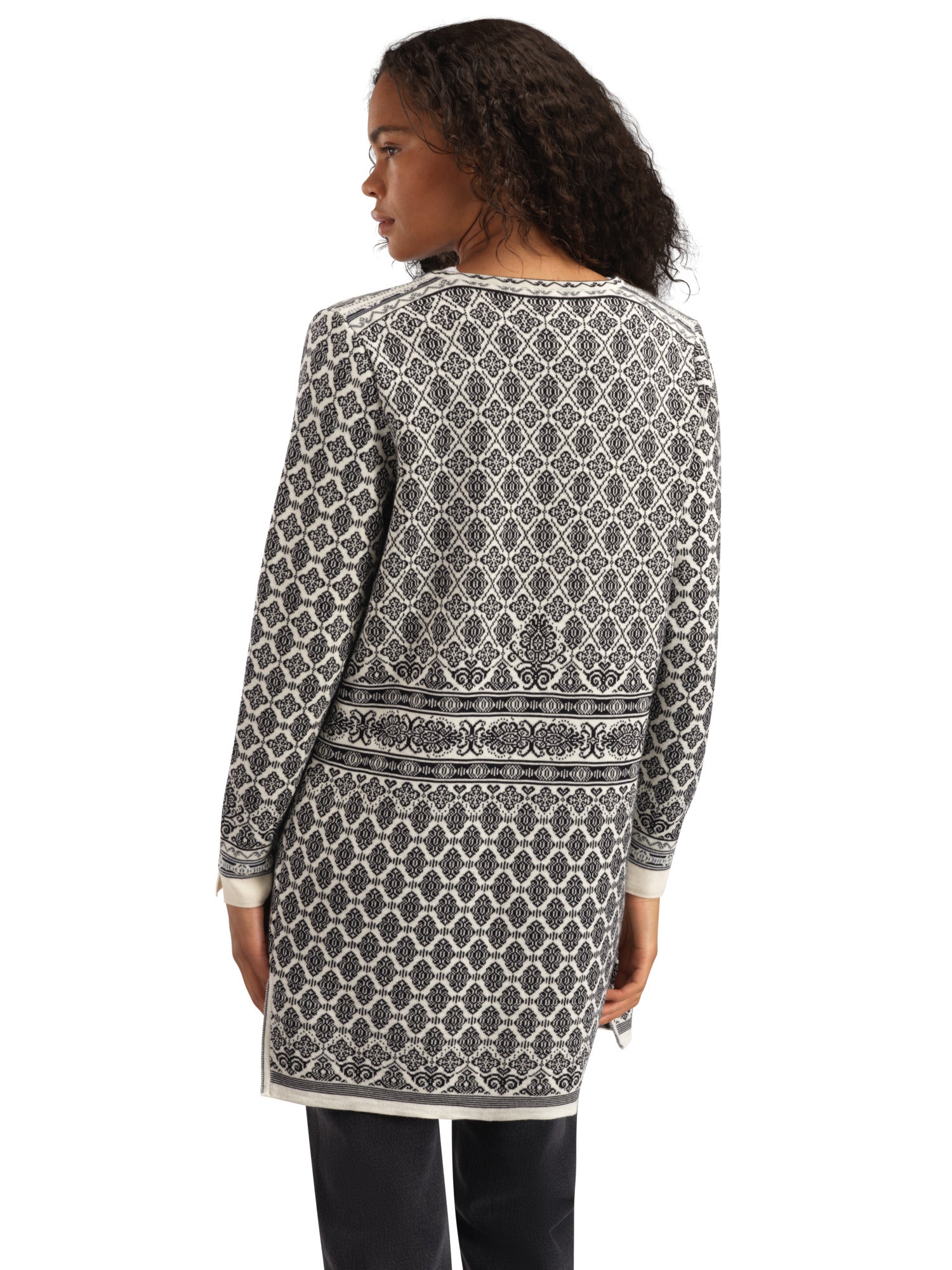 Eine lange und bequeme Jacke mit einer lockeren Passform, die Frauen aller Größen passt. Detaillierte Muster und Seitenschlitze verleihen diesem eleganten Stück die perfekte Portion Weiblichkeit. Hergestellt aus 100 % weicher und leichter Merinowolle in einer langlebigen Strickqualität.