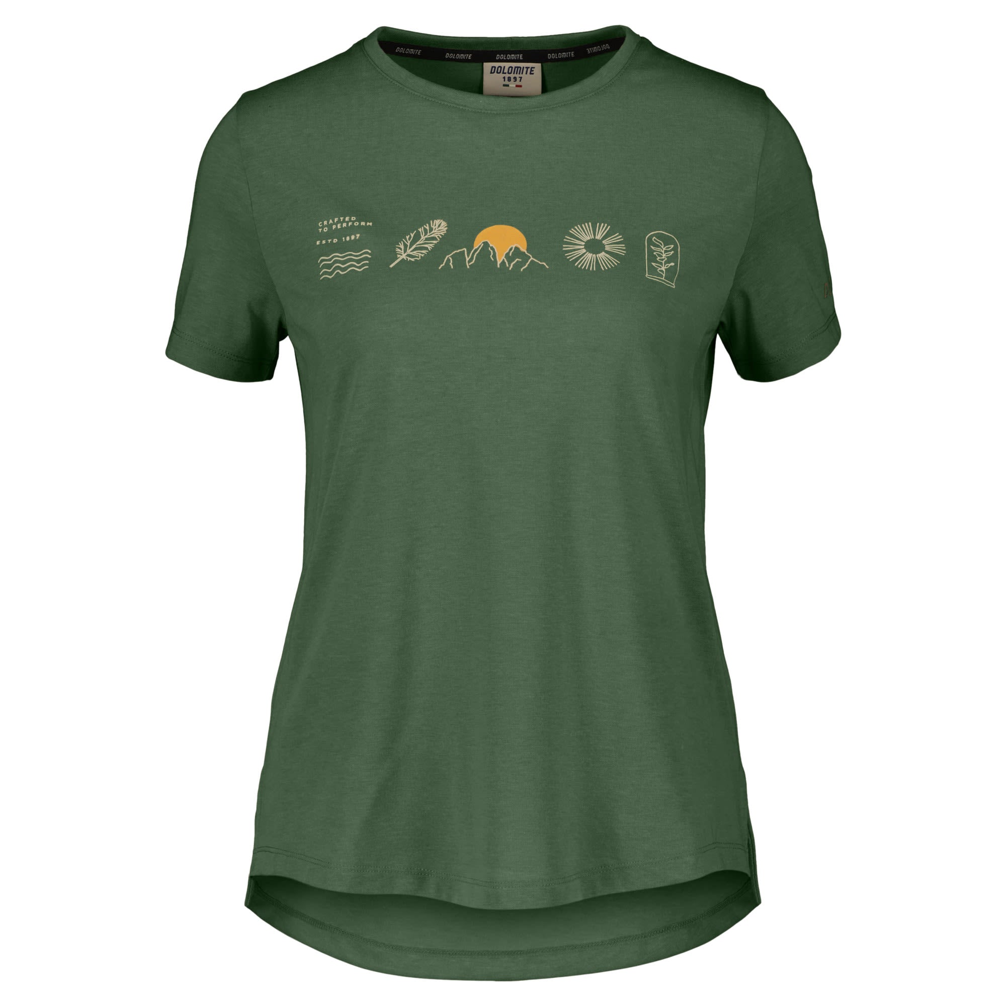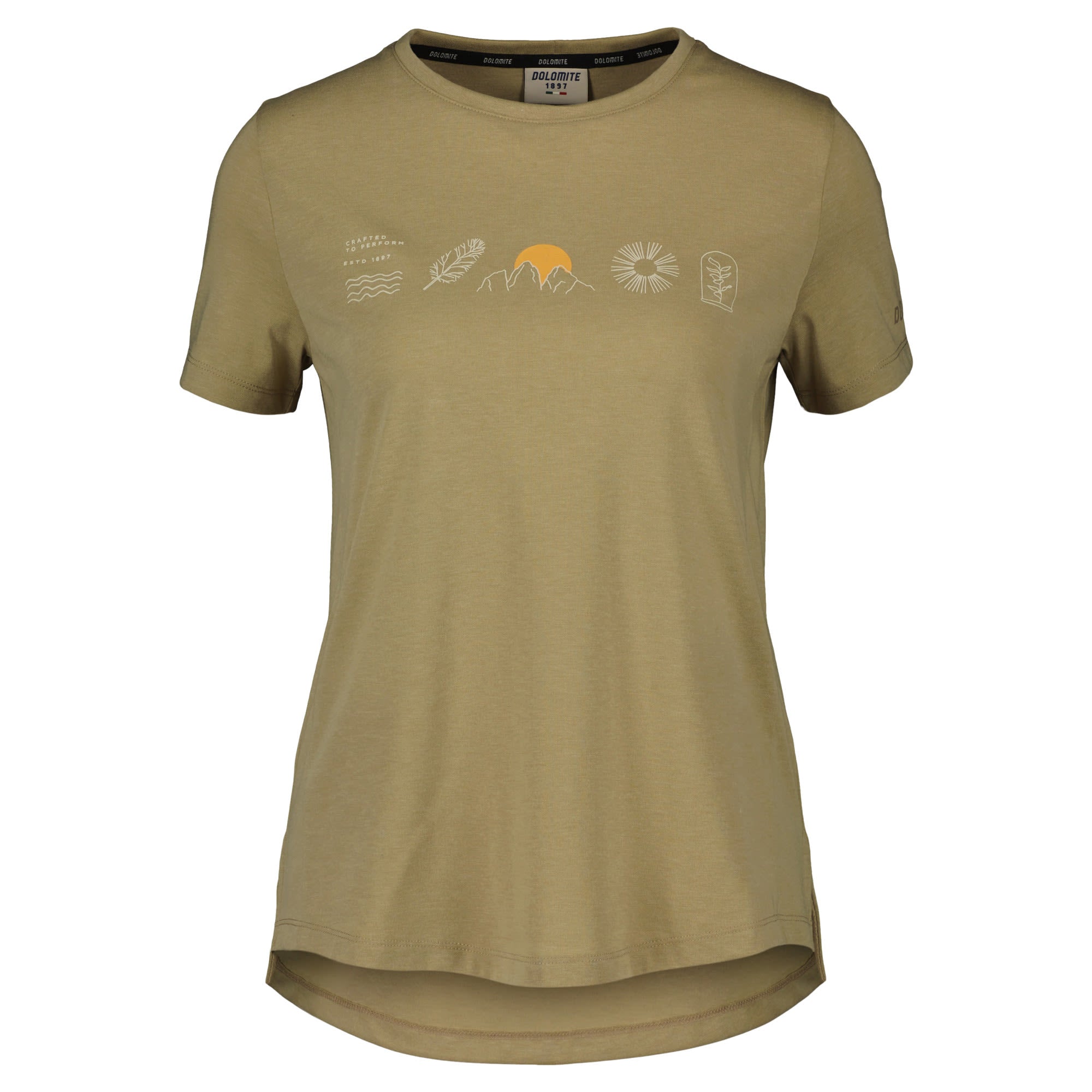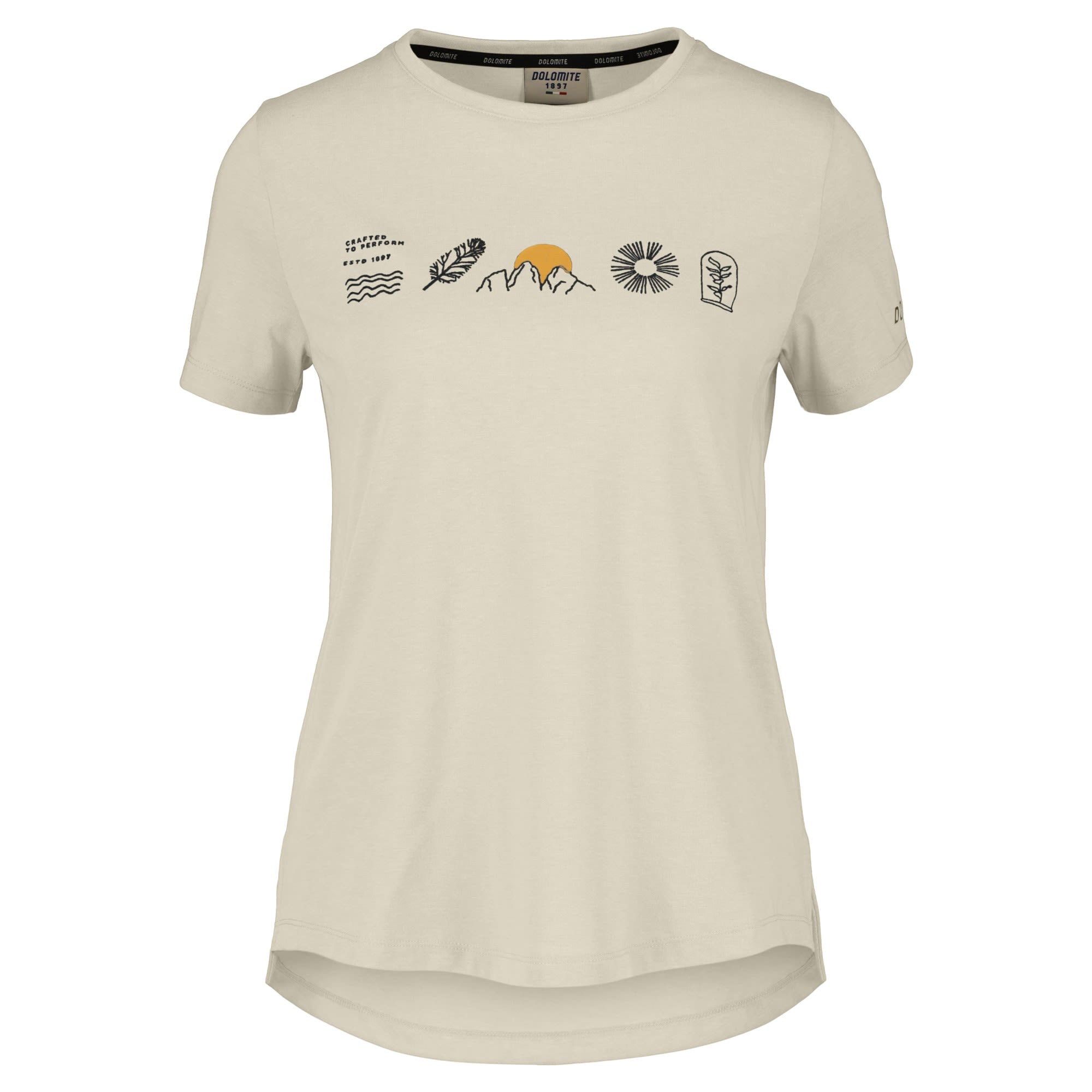 Das komfortable T-Shirt Pelmo Dri 2 SS Tee von DOLOMITE mit Rundhalsausschnitt für Damen fällt durch die charakteristischen von Bergen inspirierten Symbole auf.