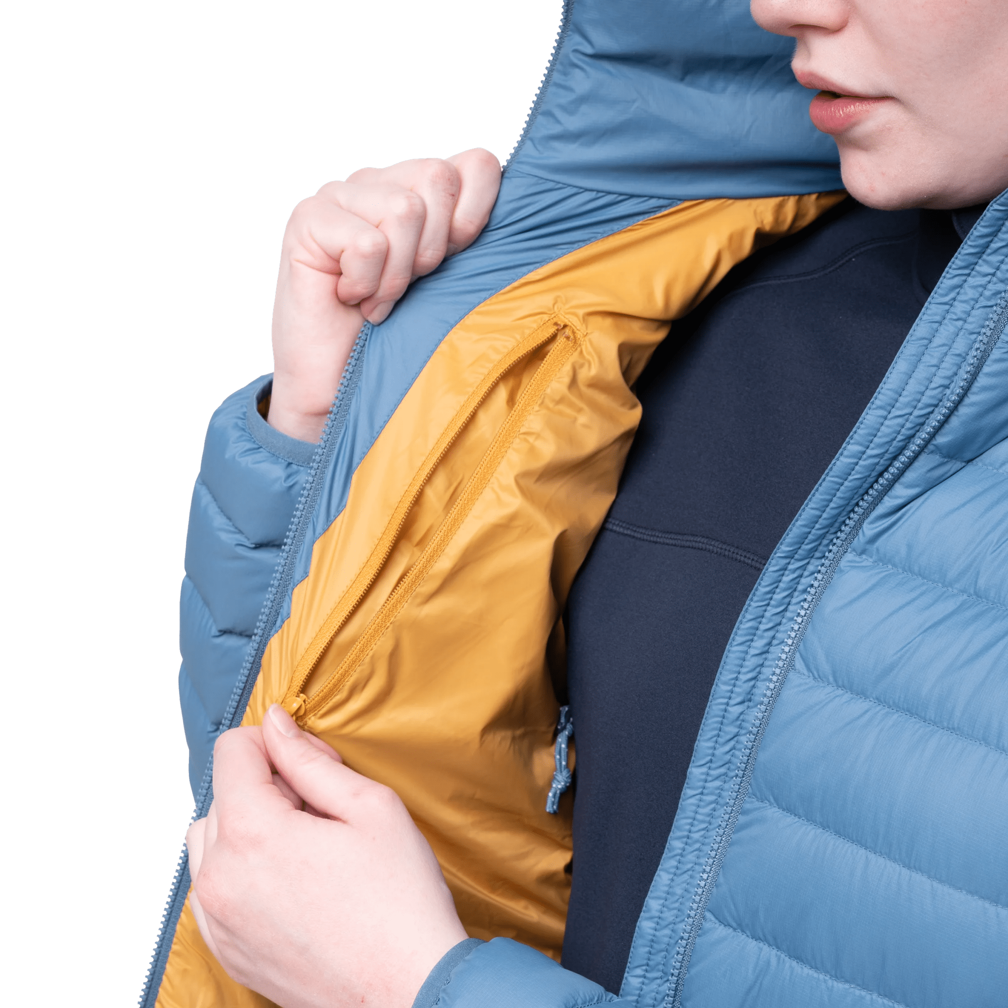 Leichte und warme Daunenjacke. Stoffe und Daunenfüllung sind zu 100% recycelt. Als warme Schicht absolut unentbehrlich.